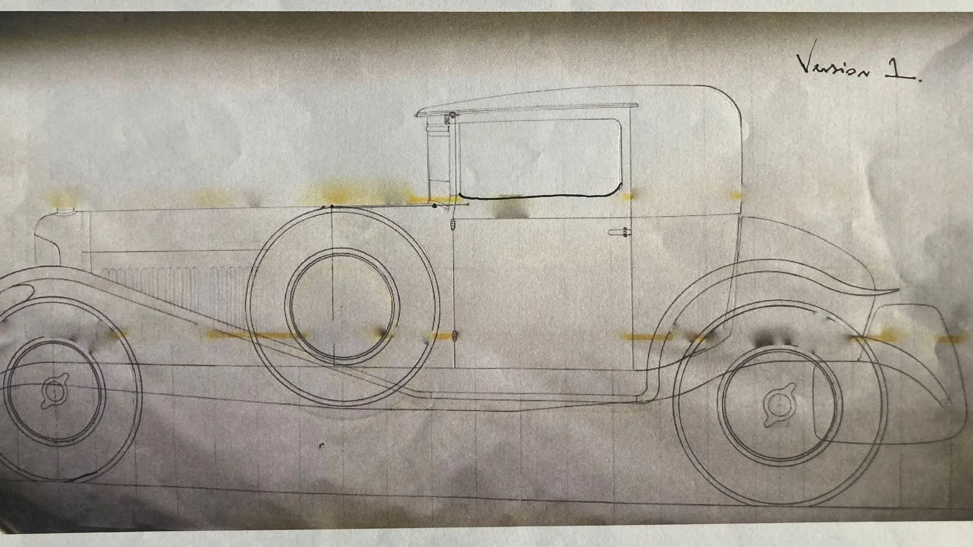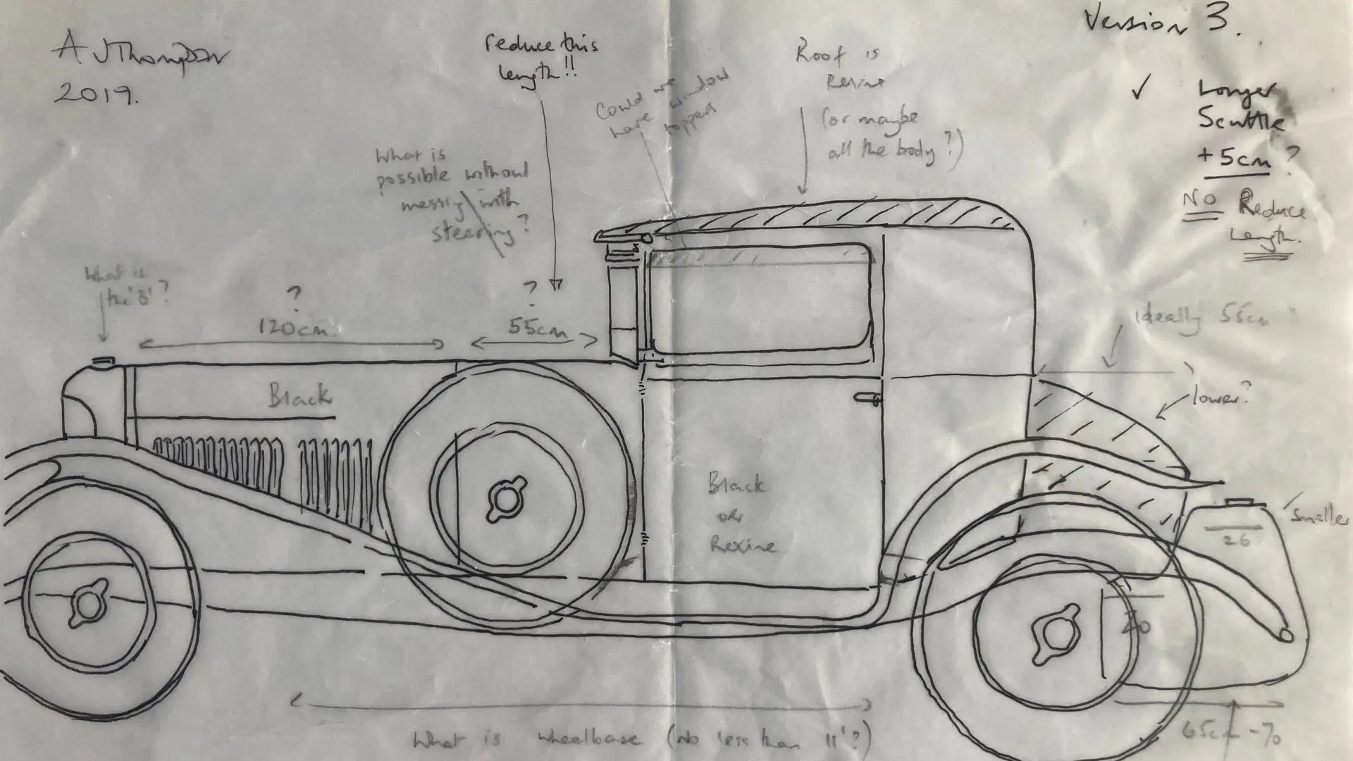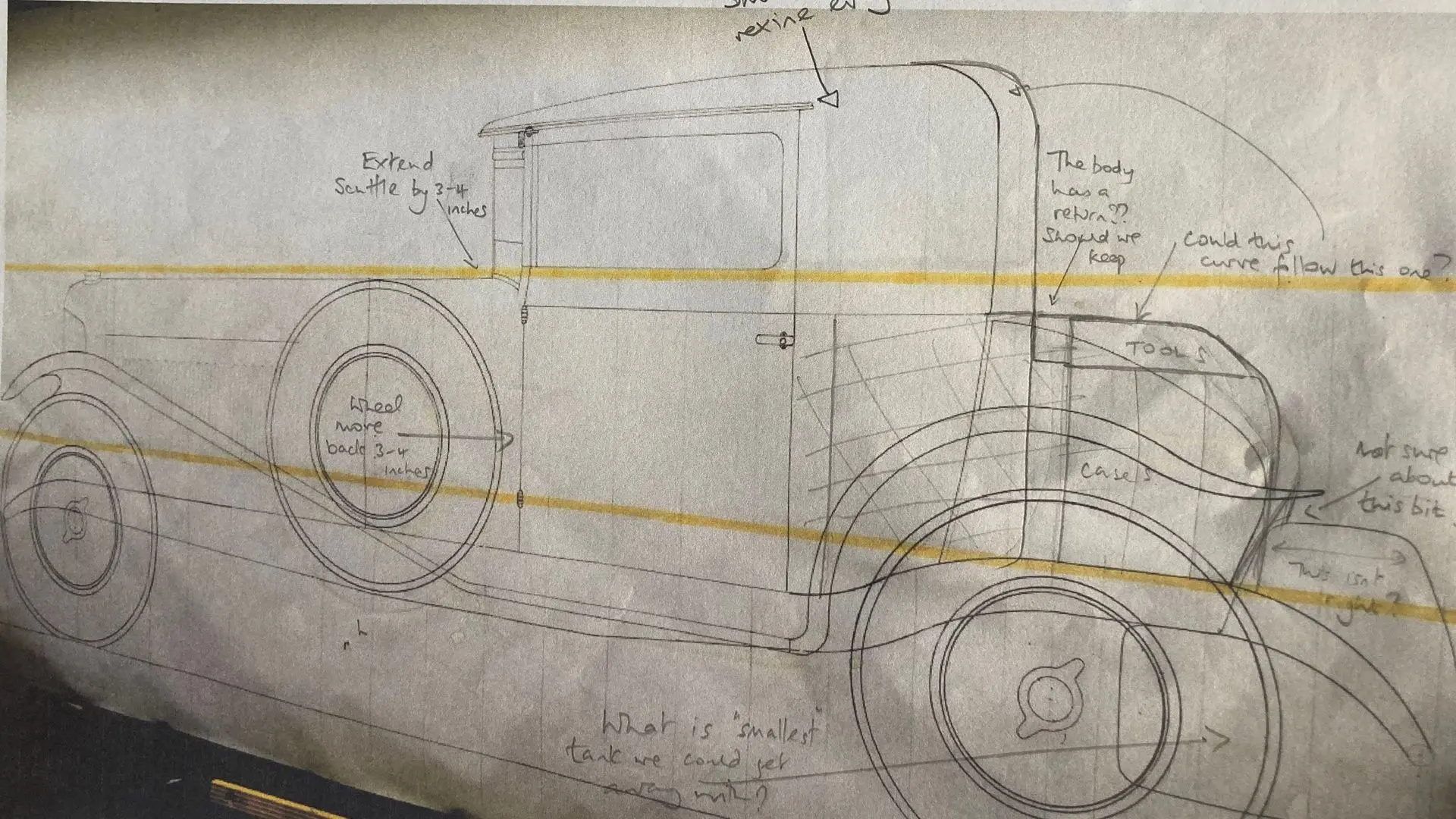I fell in love with the Harrison two-door coupe body at first sight, although I was not the only one. David Ayre had already recognised its potential and had discussed possible directions with William Medcalfe. By that point, a full-size side-profile drawing had already been produced, exploring a final design that retained the complete body while reworking the rear end.