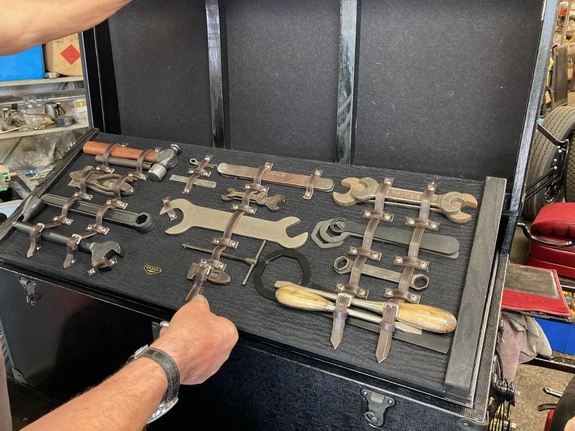 David and I debated the size repeatedly, refining it through countless small adjustments, some measured in mere millimetres. We refused to compromise and designed the lid to accommodate the full tool set. To complete this, I acquired an original Bentley 6.5 Litre instruction manual from the Claire Hays collection via Bonhams, and asked Graham Moss to source and install a complete toolkit. An original Enots jack sits in the base of the trunk, complete with a hand-made handle tailored precisely to fit.
