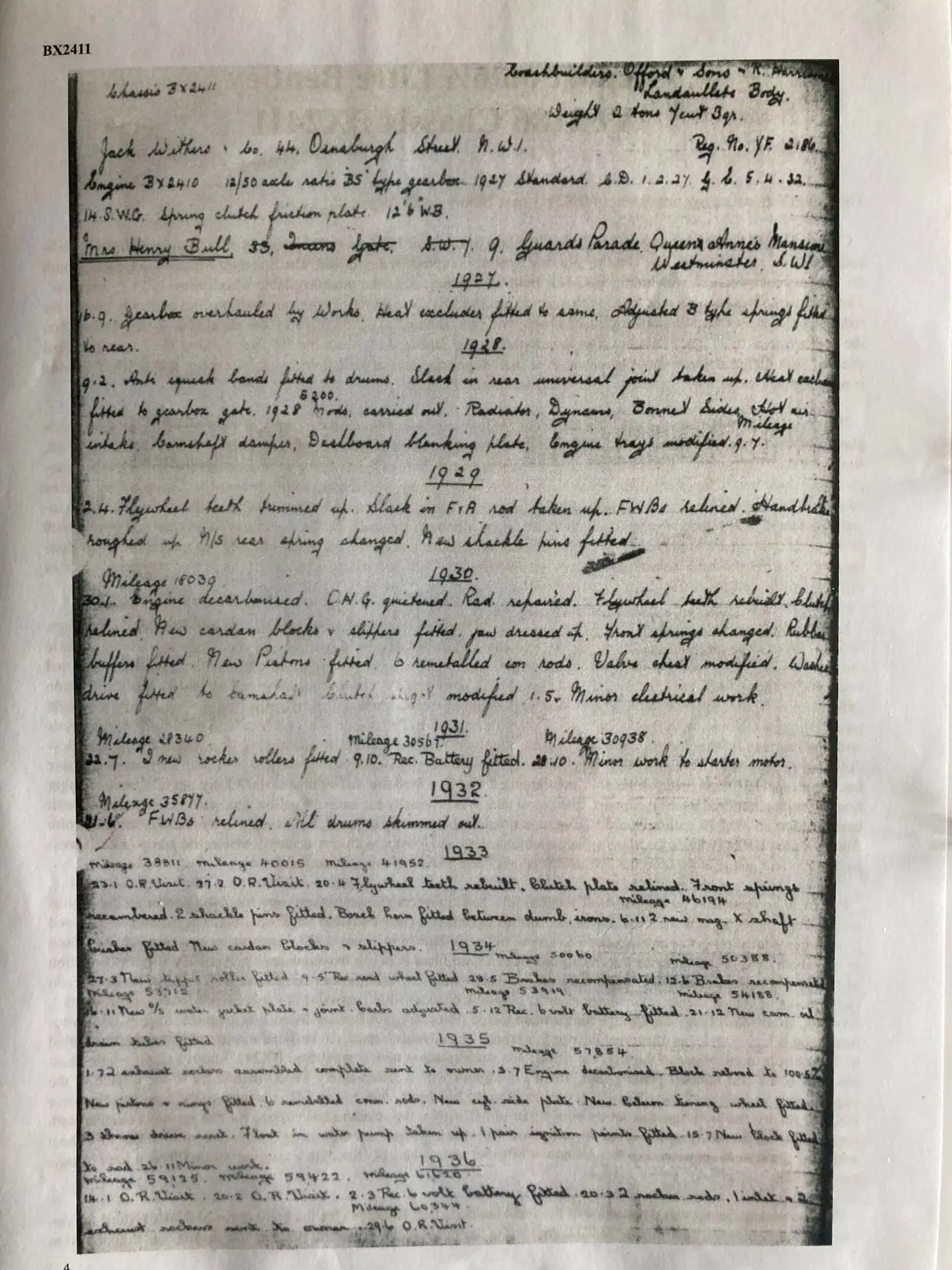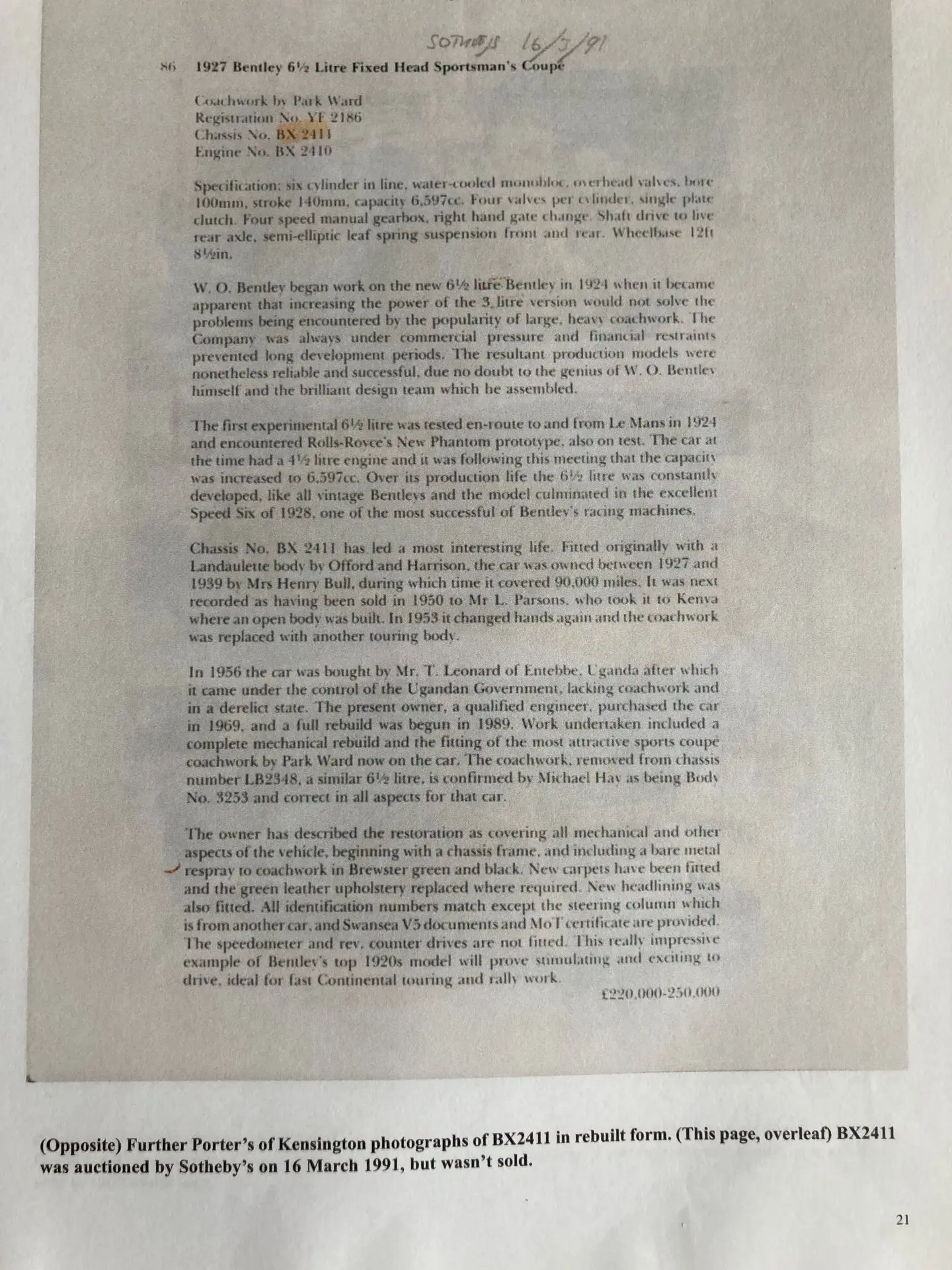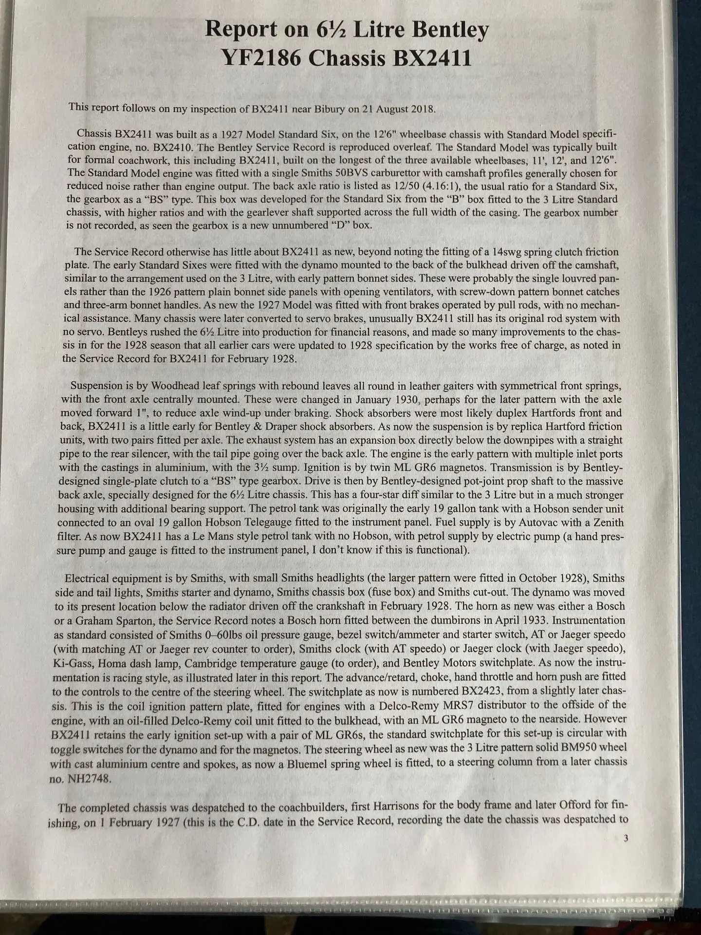 For that reason, I took a lot of solice in the 2018 Claire Hay repaort that the vendor had commissioned. Clare Hay had undertaken detailed research into YF 2186. As author of 'Bentley: The Vintage Years, her knowledge of these vehicles is unsurpassed.